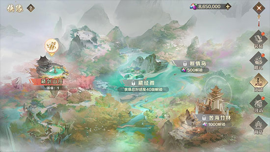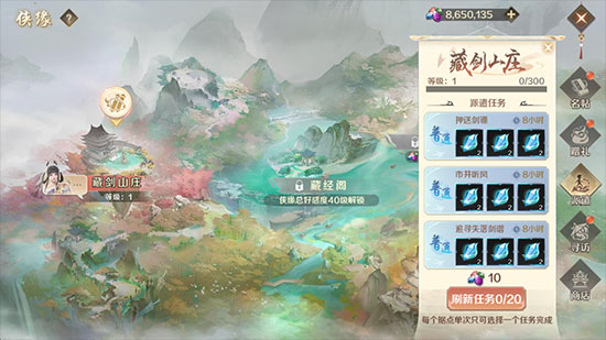 注:当前,共设有4个可供派遣的任务据点,其中藏剑山庄默认开放,藏经阁需要侠缘好感度总和达40级解锁,断情岛需消耗500天石解锁,苦海竹林需消耗1000天石解锁。