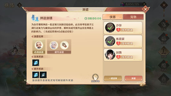 执行派遣任务,必须派遣1位侠客,可选择额外派遣1位侠客与1只灵宠,以解锁额外奖励。少侠也可发起求助,寻求其他少侠支援1个侠客或灵宠。同时只能1个据点的任务接受支援,且只能接受1个少侠支援。