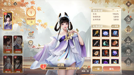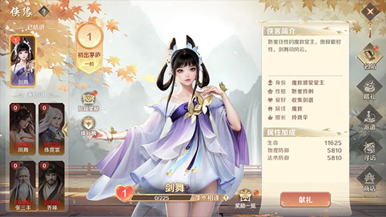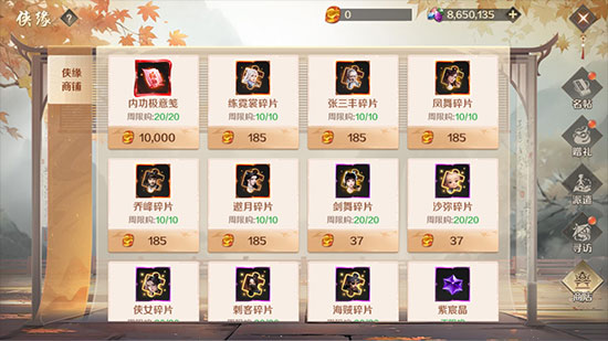 点击界面右侧的“商店”按钮,可在侠缘商店中以仙缘玉兑换各种角色碎片、好感度礼物等好礼。