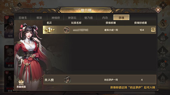 当少侠拥有“初出茅庐”侠缘称谓时,便有资格进入侠缘排行榜,角逐排名,收获奖励!