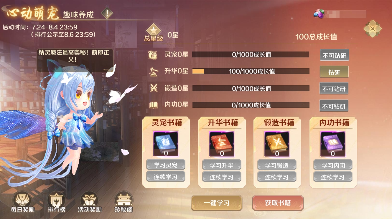 1、活动期间内,各位大侠可通过消耗对应书籍对灵宠星月在灵宠、升华、锻造、内功四个方向进行学习培养。每次学习会提升对应属性100、200、400点成长值,以获得更高星级提升。当达到任一学习方向10星时,大侠仍可继续获得书籍持续提升成长值哦!