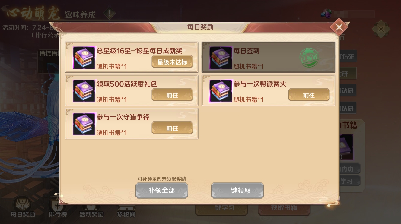 活动期间若遇到未及时完成每日任务的情况,大侠可以通过每日奖励界面里的补领奖励按钮,点击后可消耗天石一键完成之前未完成的任务,并领取对应的奖励。每个任务每次补领需消耗11天石。